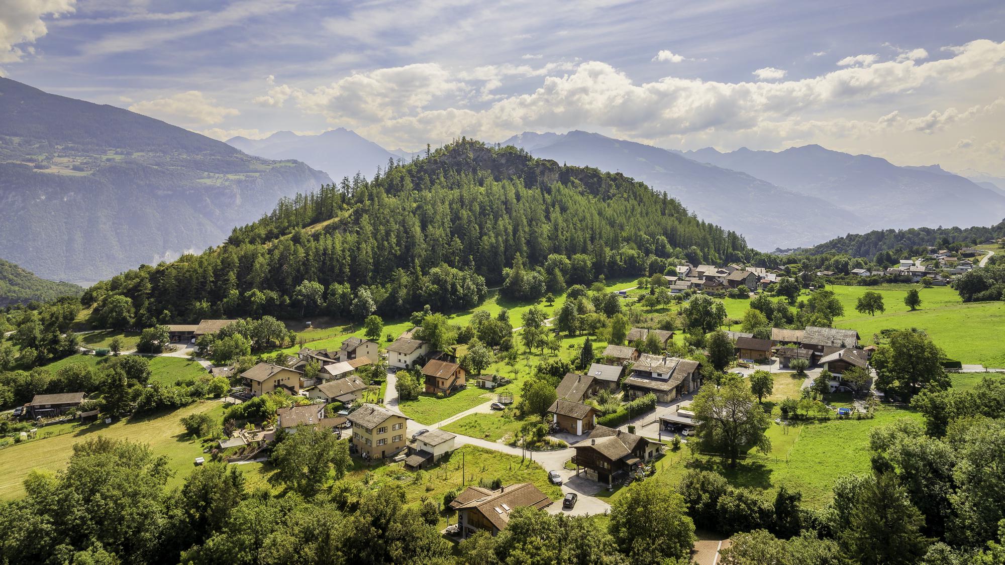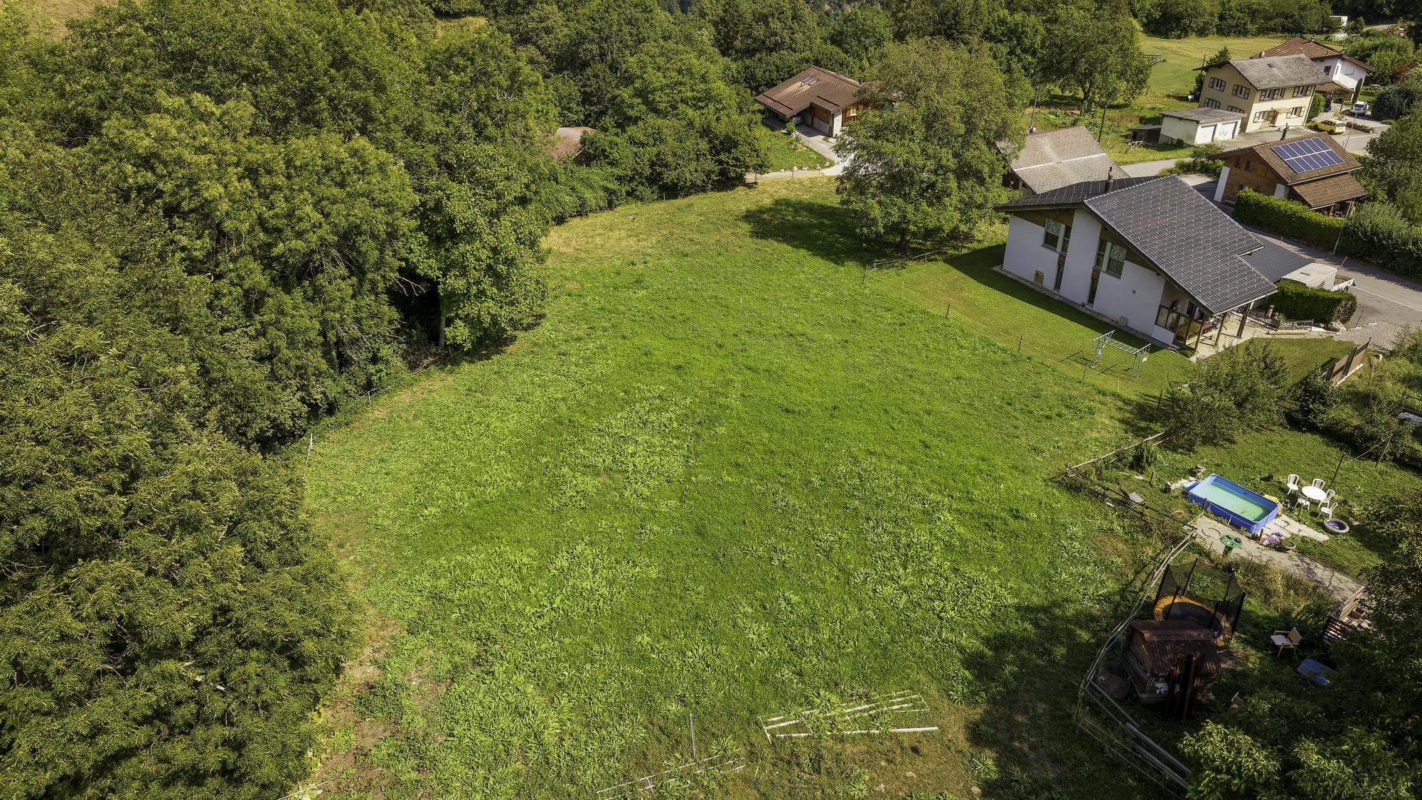 La parcelle bénéficie d’une vue dégagée exceptionnelle sur le Christ-Roi, les montagnes environnantes et le village d’Ayent.