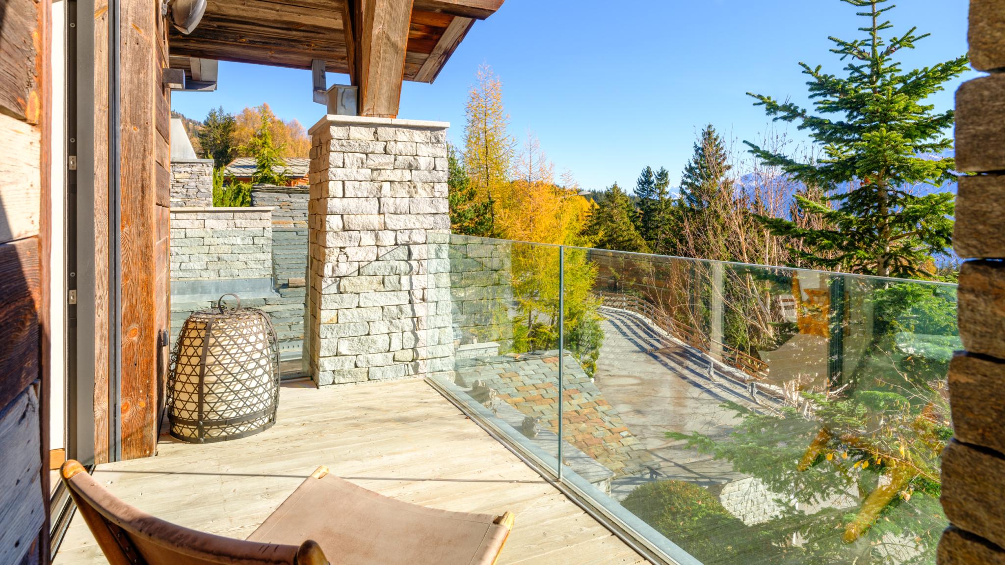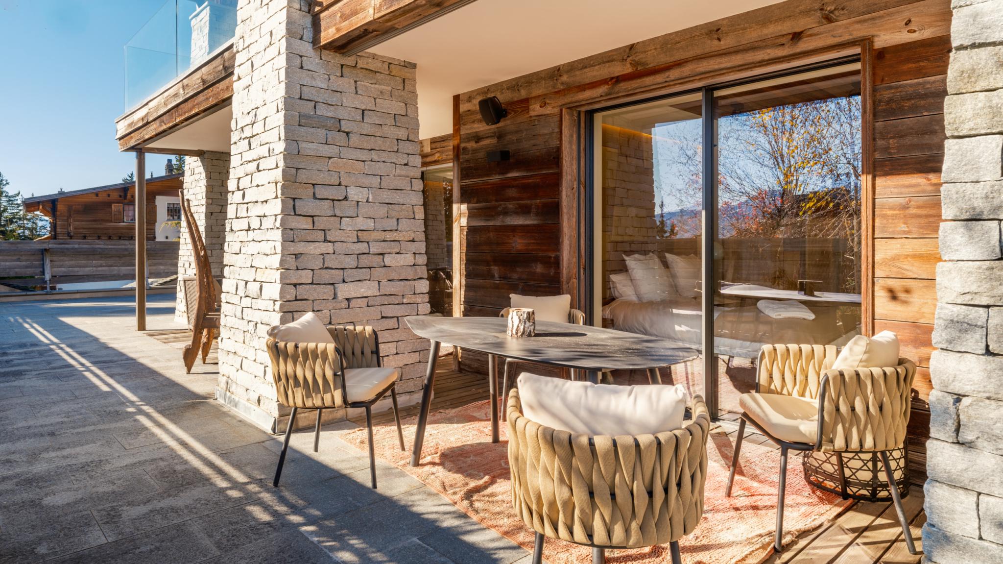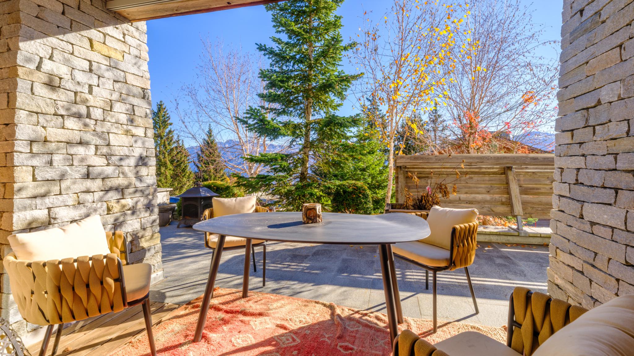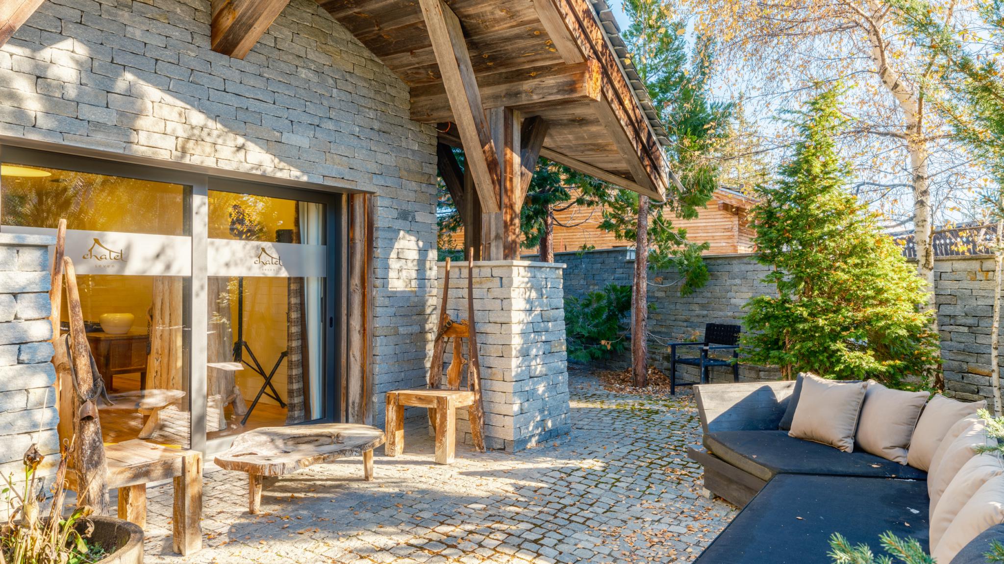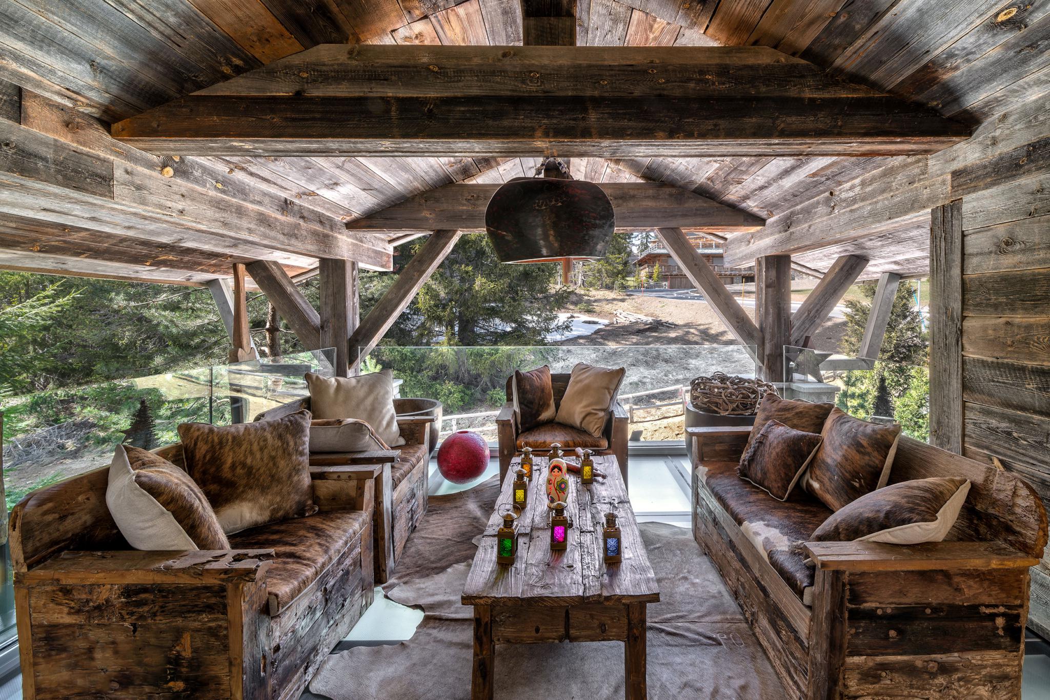 L'extérieur du chalet est véritablement exceptionnel. Le magnifique bois argenté a été spécialement sélectionné dans une ferme autrichienne de 200 ans, tandis que les murs en pierre sèche sont réalisés à partir de pierre de cristal grise, extraite localement. La propriété dispose de plus de 800 m² de terrasses entourées d'arbres matures, garantissant une discrétion totale. Les jardins paysagers présentent des arbres rares soigneusement choisis du monde entier, notamment des Gingko, des Bouleaux blancs, des Mélèzes, des Pins nuages et des Érables.