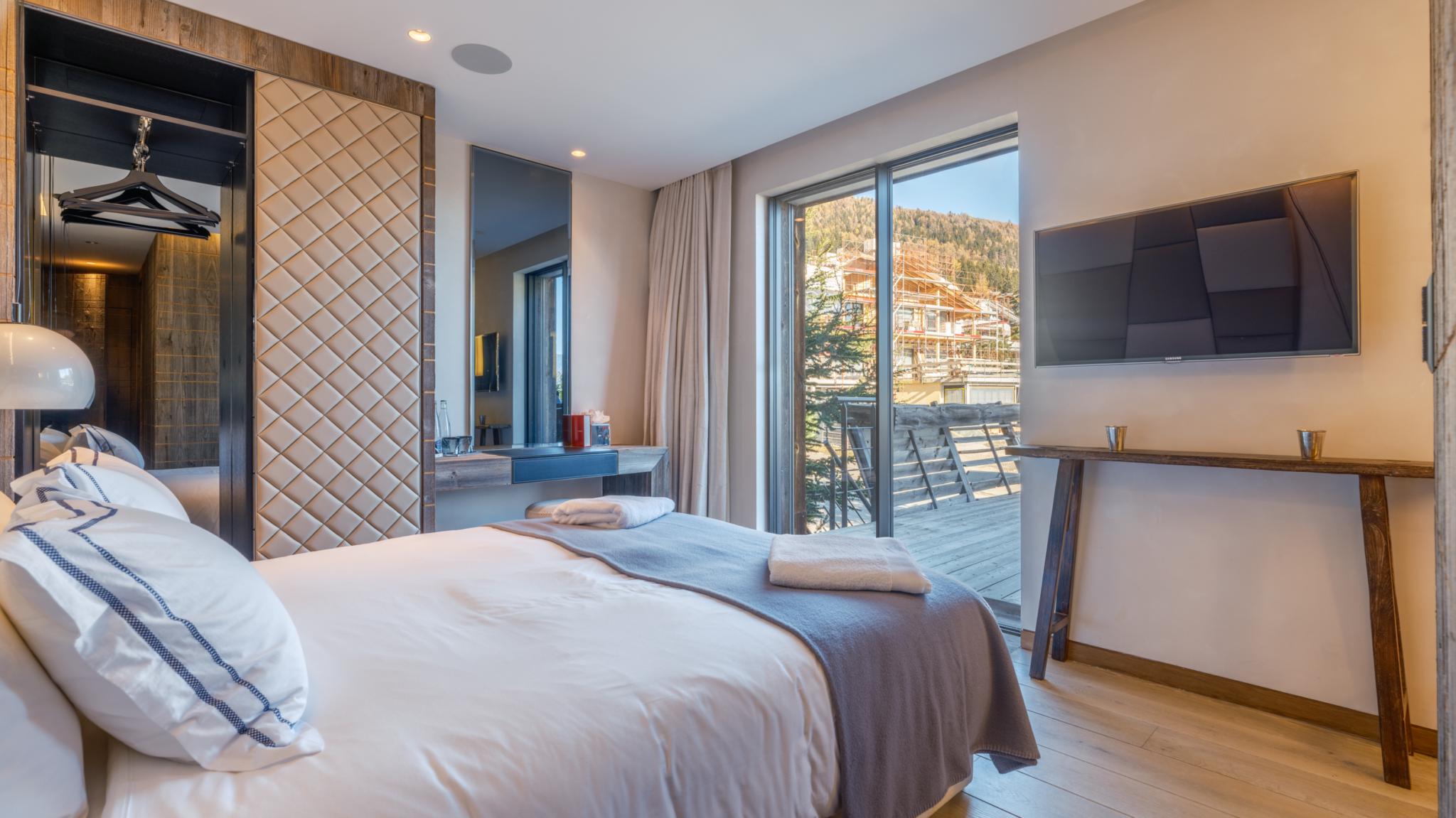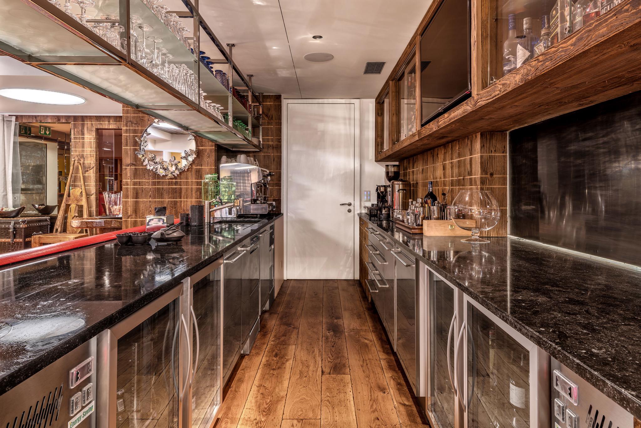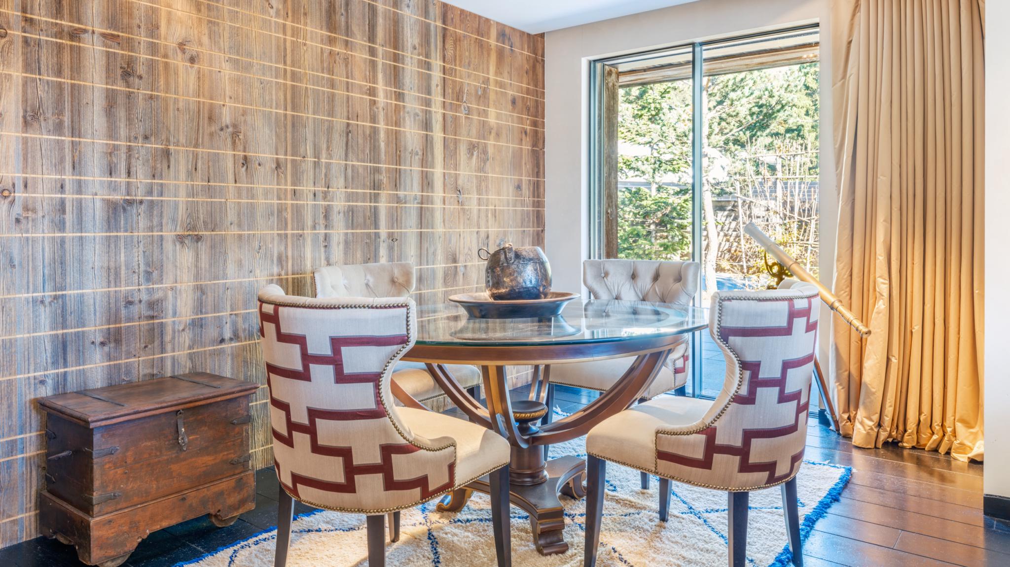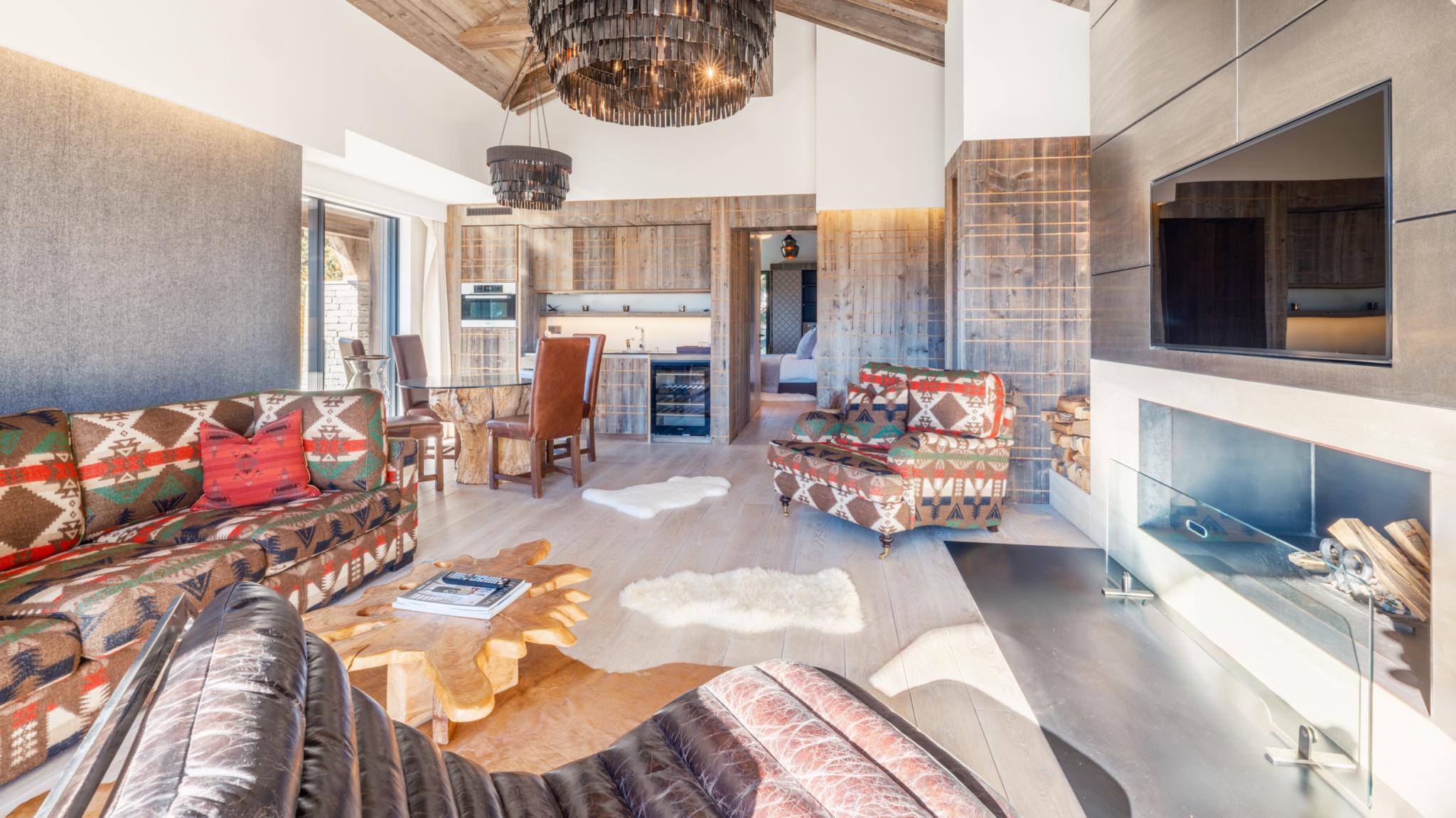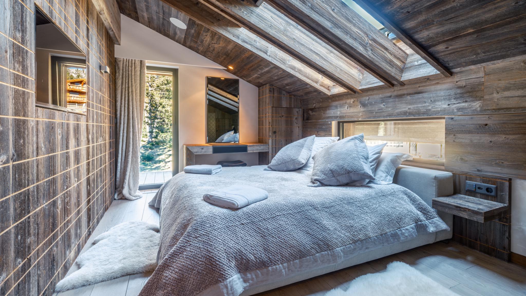 L'extérieur du chalet est véritablement exceptionnel. Le magnifique bois argenté a été spécialement sélectionné dans une ferme autrichienne de 200 ans, tandis que les murs en pierre sèche sont réalisés à partir de pierre de cristal grise, extraite localement. La propriété dispose de plus de 800 m² de terrasses entourées d'arbres matures, garantissant une discrétion totale. Les jardins paysagers présentent des arbres rares soigneusement choisis du monde entier, notamment des Gingko, des Bouleaux blancs, des Mélèzes, des Pins nuages et des Érables.